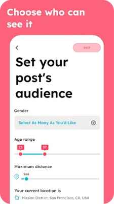 - Audience: Choose who can see your post and who can message you. You can restrict your audience by gender, age, and location, and you can choose whether traveling users can see your post
