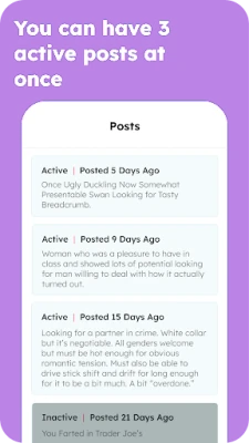 - Create Multiple Posts: We understand that people can have more than one way to express themselves. That's why we allow 7 active posts at a time, offer 6 different post categories to choose from, and allow users to tag their post as kink-friendly if they'd like to
