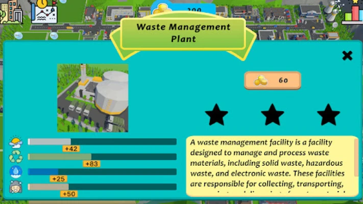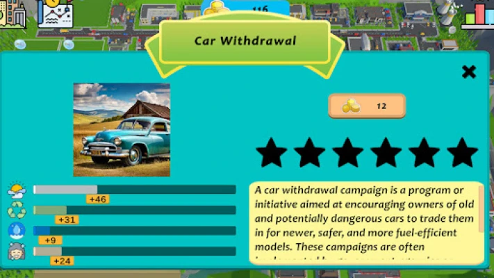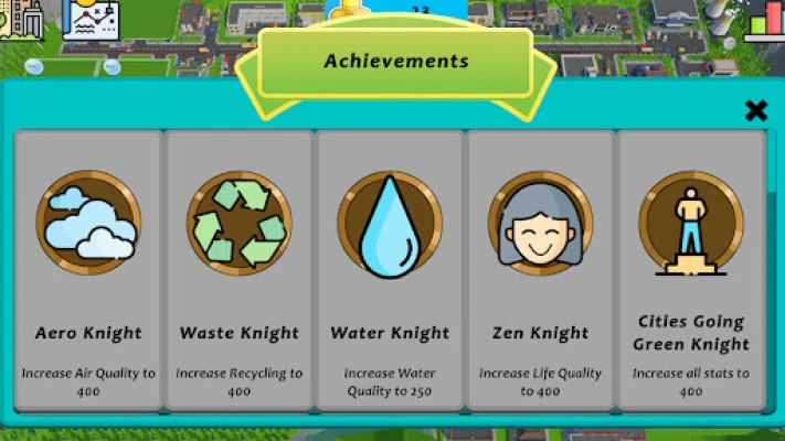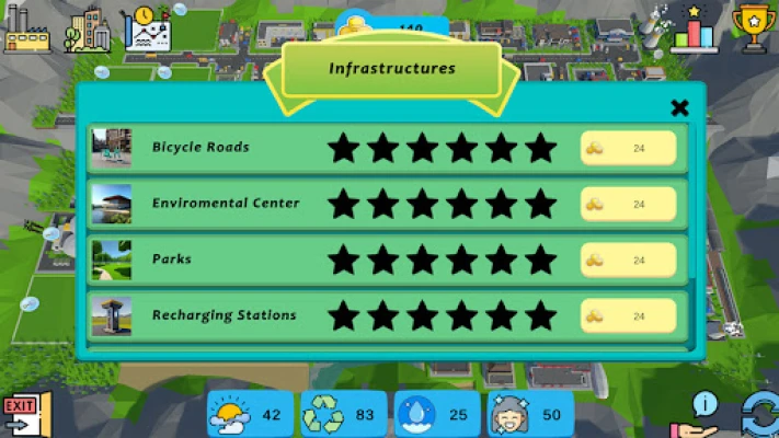 A game for kids to manage their city in order to improve 4 different city values. Air Quality, Recycling, Water and Overall Life Quality. Every 5 days, players receive more coins to be able to apply different policies (build parks, bicycle roads, run campaigns for recycling, etc.). Badges are awarded if some milestones are reached.