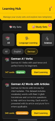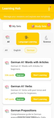 - **German A1 Words with Articles** (336 cards: Beginner German vocabulary with articles and plural forms)