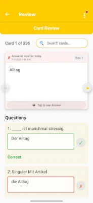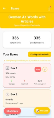 The app prioritizes cards due for review, focusing your time on what needs attention most, with automatic promotion/demotion between boxes.