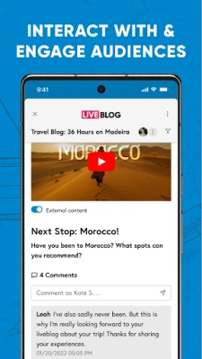 INTERACT WITH & ENGAGE AUDIENCES: With features like live-commenting blocks, simple poll and quiz integrations, and easy sharing capabilities, Live Blog makes it easy for you to interact with your readers and gain the insights your team needs to optimize your subscriptions.
